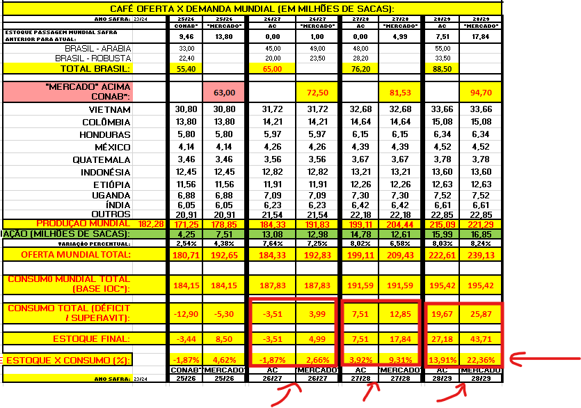 Para nossa analise (consideramos a produção com base nos dados do USDA* mas o consumo com base nos dados da OIC*) então o mercado na safra 25/26 terá ainda um déficit em -5,15 milhões de sacas (segundo a OIC* agora em 25/26 o consumo mundial já está acima dos 184 milhões de sacas)!
