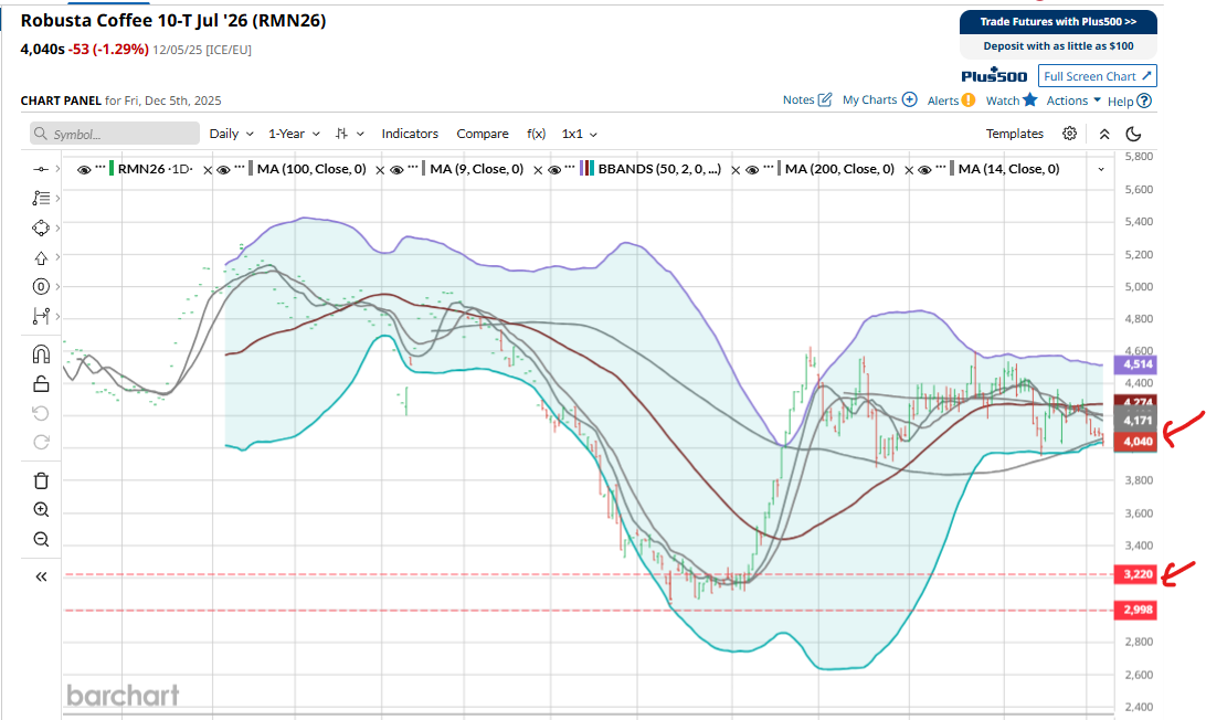 O produtor brasileiro continua vendendo muito pouco e segurando estoque aguardando melhores preços para o primeiro trimestre 2.026. Por outro lado, muitos analistas já estão preocupados pois em abril-26 (daqui a praticamente 4,50 meses) o Brasil já irá iniciar a colheita da próxima safra 26/27. O saldo ainda nas mãos do produtor poderá gerar uma “pressão de venda” pressionando os preços. Vale lembrar que agora na safra 25/26, por exemplo, os preços do café conilon despencaram dos 2.000 R$/saca para 950 R$/saca para depois recuperarem para os preços atuais. E os preços do café arábica caíram dos 2.800/2.900 R$/saca ate os 1.800 R$/saca e agora estão negociando no patamar dos 2.300 R$/saca.